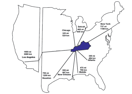 Bluegrass Crossings is located in the gently rolling hills of Ohio County, Kentucky at the intersection of William H. Natcher Parkway and Western Kentucky Parkway. Each of these parkways have links to interstate highways. The park is also within minutes of a major riverport ready to serve your intermodal needs. Our location is advantageous because Bluegrass Crossings is central to much of the distribution centers in the United States. We are within 600 (+/-) miles of more than 60% of the nation’s population, personal income and manufacturing business establishments. A major consideration when shipping products, meeting a customer, or closing a sale.